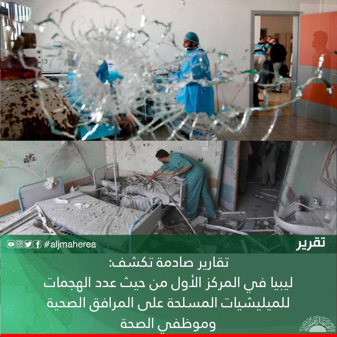 واشار التقرير إلى أن منظمة الصحة العالمية صنفت ليبيا في المركز الأول من حيث عدد الهجمات للمليشيات المسلحة على المرافق الصحية وموظفي الصحة من اي النار /يناير إلى الماء /مايو الماضيين.