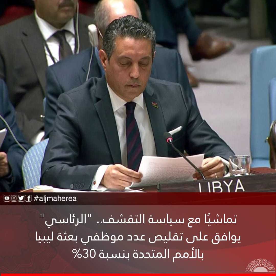 تماشيا مع سياسة التقشف بالخارج، وحرصاً على الوضع المالي والاقتصادي الراهن وترشيد الإنفاق، وتماشياً مع توصيات الأجهزة الرقابية والمالية بالدولة، وفق ما جاء في بيان خارجية الوفاق، اعتمد المجلس الرئاسي لحكومة الوفاق – غير الشرعية – مقترحا مقدما من وزارة الخارجية، بالتنسيق مع بعثة ليبيا لدى الأمم المتحدة بنيويورك، بإعادة هيكلة البعثة وتقليص ملاكها الوظيفي، ليتم خفض المصروفات وعدد الموظفين بنسبة 30%.