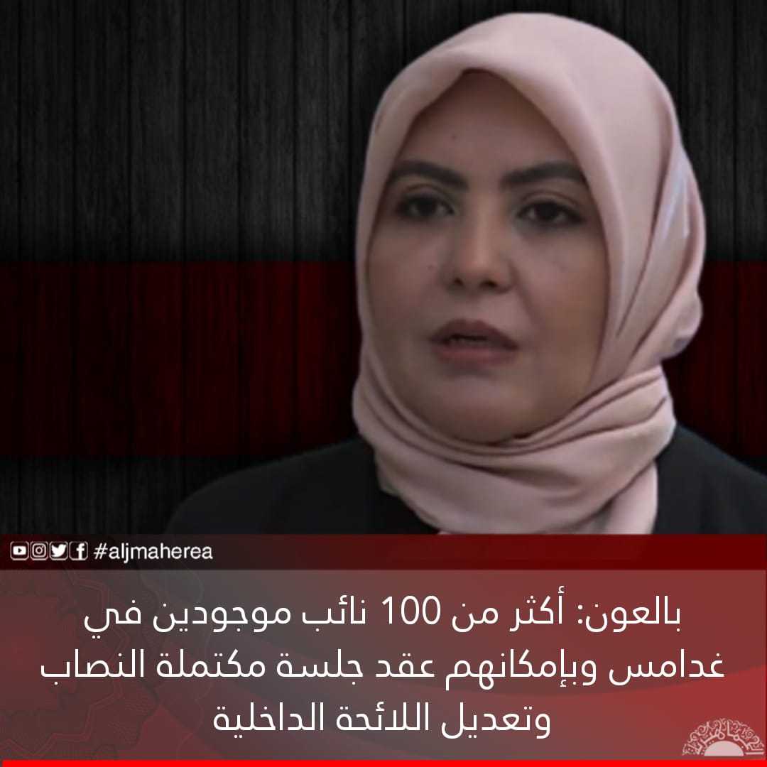 وشددت بالعون، أن النواب المجتمعون في غدامس، ماضون في تعديل اللائحة الداخلية للمجلس وانتخاب رئاسة جديدة له، تقود ما تبقى من المرحلة الانتقالية التي ستفضي إلى انتخابات رئاسية وتشريعية.