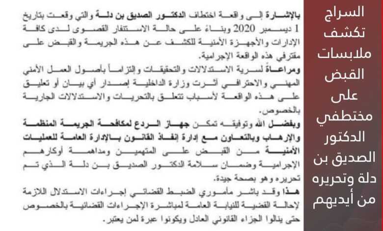 أصدرت وزارة الداخلية بحكومة الوفاق غير الشرعية، بيانّا أوضحت فيه ملابسات القبض على مختطفي الدكتور الصديق بن دلة.