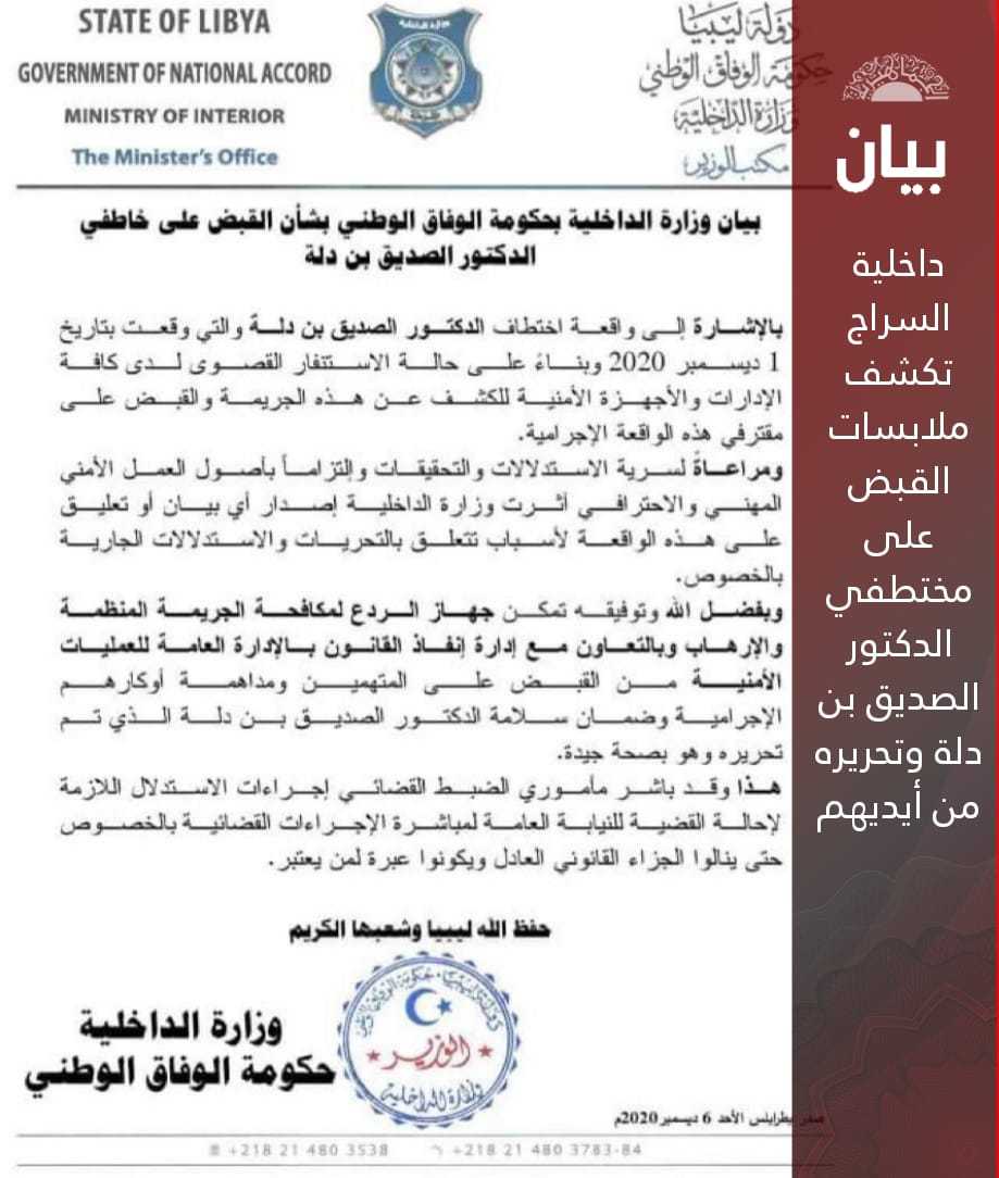 أصدرت وزارة الداخلية بحكومة الوفاق غير الشرعية، بيانّا أوضحت فيه ملابسات القبض على مختطفي الدكتور الصديق بن دلة.