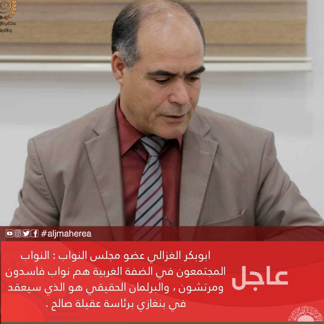 عاجل//ابوبكر الغزالي عضو مجلس النواب : النواب المجتمعون في الضفة الغربية هم نواب فاسدون ومرتشون ، والبرلمان الحقيقي هو الذي سيعقد في بنغازي برئاسة عقيلة صالح .