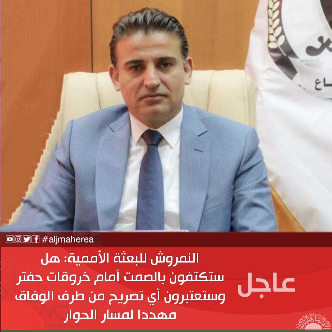 عاجل// النمروش للبعثة الأممية: هل ستكتفون بالصمت أمام خروقات حفتر وستعتبرون أي تصريح من طرف الوفاق مهددا لمسار الحوار 5 سنوات ago عاجل// النمروش للبعثة الأممية: هل ستكتفون بالصمت أمام خروقات حفتر وستعتبرون أي تصريح من طرف الوفاق مهددا لمسار الحوار مقالات ذات صلة بسيكري: الفساد في ليبيا منظومة مترسخة تحميها مؤسسات مختلة وغياب الرقابة إسماعيل: الأزمة سياسية ليست دستورية والحل في حكومة موحدة تسبق الانتخابات غازيني تكشف غموض “الحوار المهيكل” وانتقادات لآليات الاختيار والأهداف