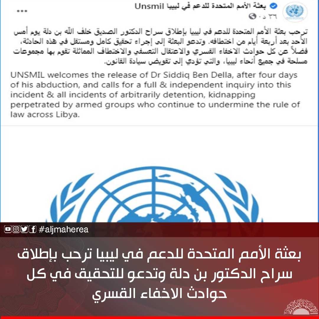 رحبت بعثة الأمم المتحدة للدعم في ليبيا بإطلاق سراح الدكتور الصديق خلف الله بن دلة يوم أمس الأحد بعد أربعة أيام من اختطافه.
