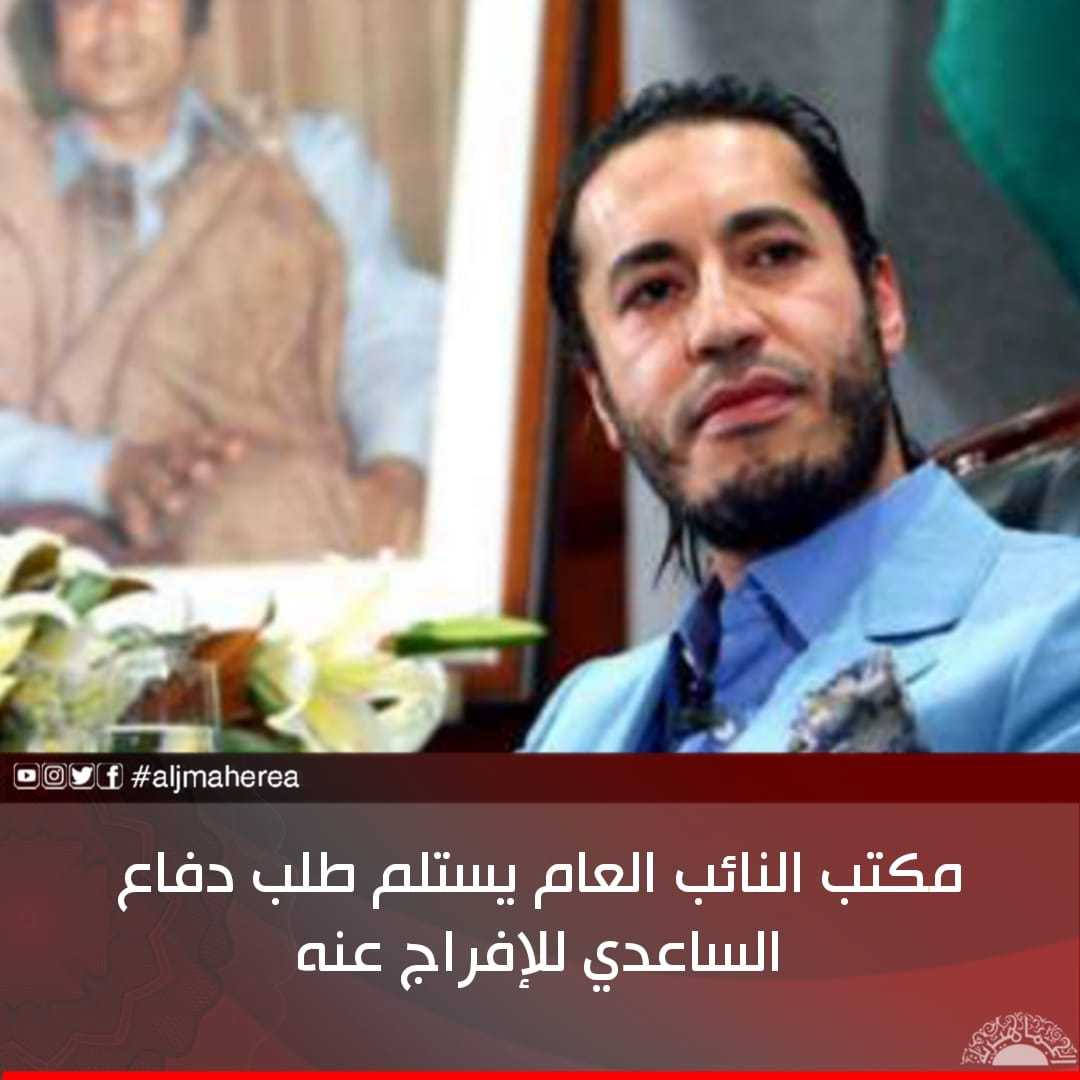 استلم مكتب النائب العام طلبا من فريق الدفاع عن اللواء الساعدي معمر القذافي، يطالب فيها بالإفراج عنه، بعد صدور حكم نهائي بتبرئته قبل أكثر من عامين عن محكمة استئناف طرابلس.