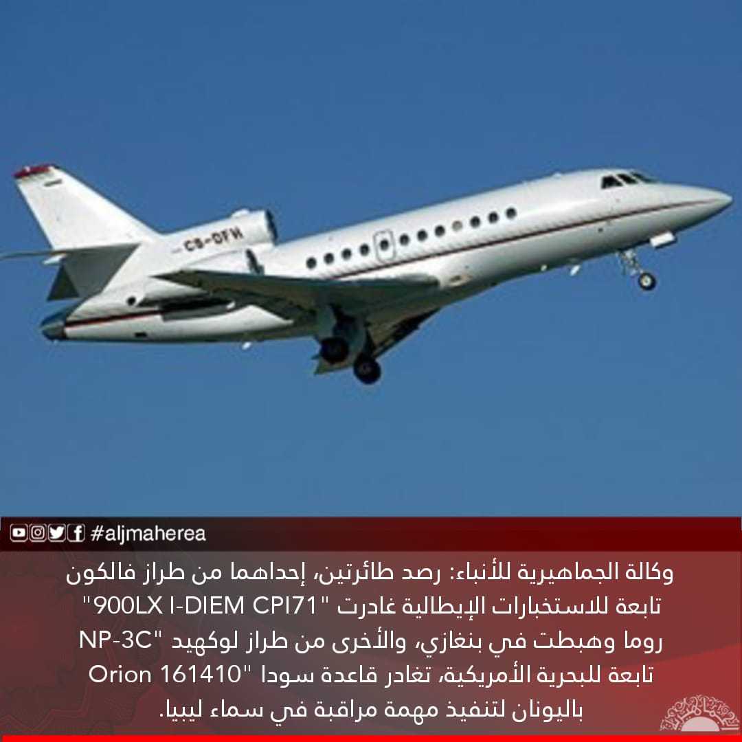 وكالة الجماهيرية للأنباء: رصد طائرتين، إحداهما من طراز فالكون “900LX I-DIEM CPI71” تابعة للاستخبارات الإيطالية غادرت روما وهبطت في بنغازي، والأخرى من طراز لوكهيد “NP-3C Orion 161410” تابعة للبحرية الأمريكية، تغادر قاعدة سودا باليونان لتنفيذ مهمة مراقبة في سماء ليبيا
