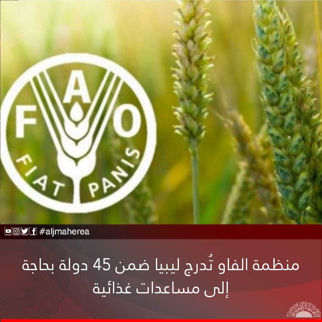 أعلنت منظمة الأغذية والزراعة التابعة للأمم المتحدة «فاو» أنها أدرجت ليبيا ضمن 45 دولة بحاجة إلى مساعدة خارجية من أجل الغذاء.