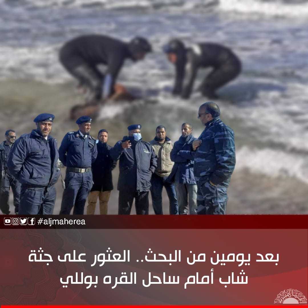 وعثرت فرقة التحري بنقطة أمن السواحل القره بوللي وفرقة الغطس بفرع الإدارة طرابلس على جثة الشاب، التي نقلت إلى الجهات ذات الاختصاص لاستكمال الإجراءات القانونية والتحقيقات.
