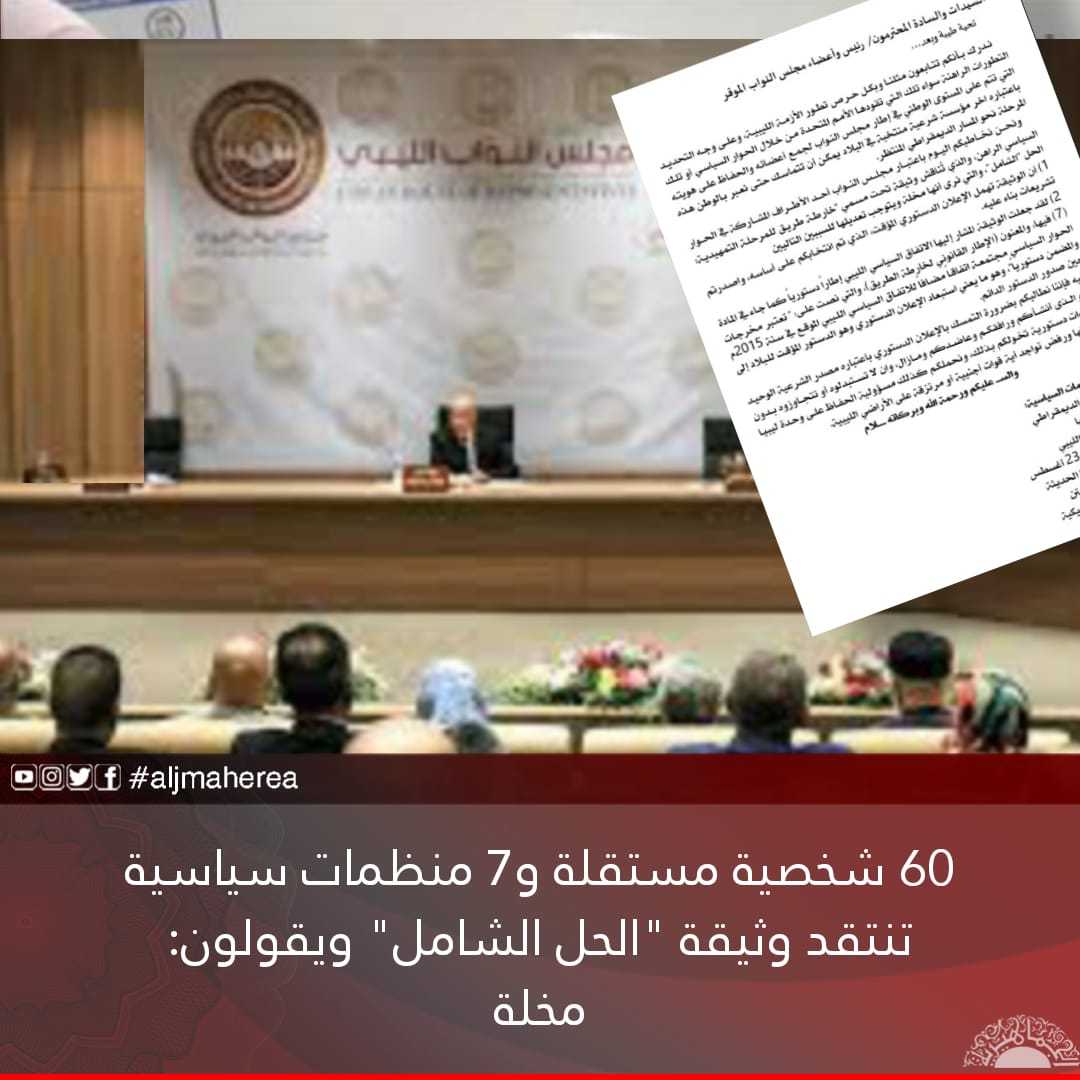 في إطار الزخم السياسي الموجود في ليبيا، أصدرت 7 منظمات سياسية، منها التكتل المدني الديمقراطي، وتكتل إحياء ليبيا، والحراك الوطني الليبي، وغيرهم، بالإضافة الى 60 شخصية مستقلة، بيانا خاطبوا فيه رئيس وأعضاء مجلس النواب باعتباره أحد الأطراف المشاركة في الحوار السياسي الراهن الذي يناقش وثيقة، خارطة طريق للمرحلة التمهيدية “الحل الشامل”.