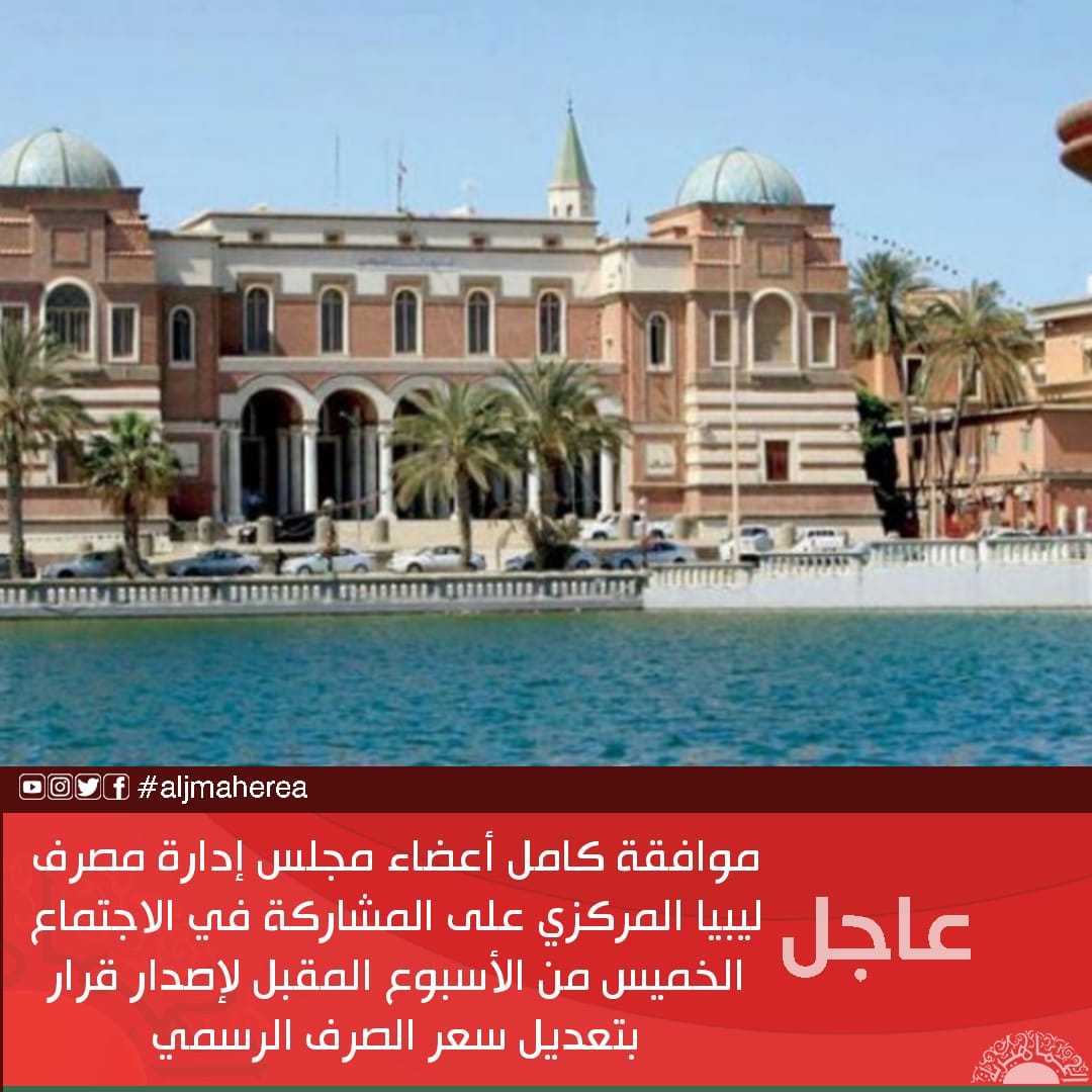 عاجل // موافقة كامل أعضاء مجلس إدارة مصرف ليبيا المركزي على المشاركة في الاجتماع الخميس من الأسبوع المقبل لإصدار قرار بتعديل سعر الصرف الرسمي
