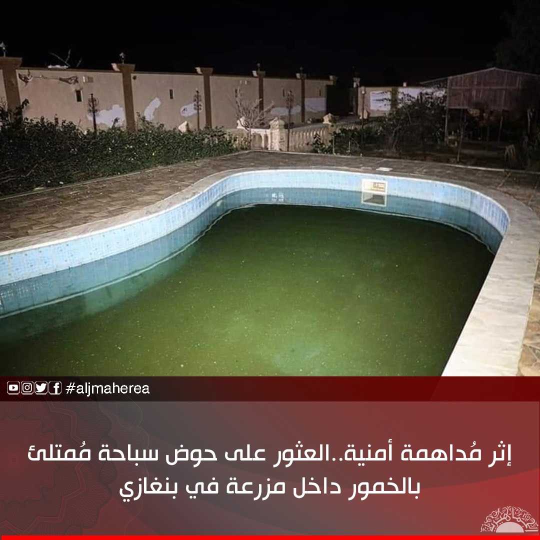 وذكرت مواقع ليبية أن القوة الأمنية عثر على حوض سباحة داخل المزرعة مُمّتلئ بالخمور.