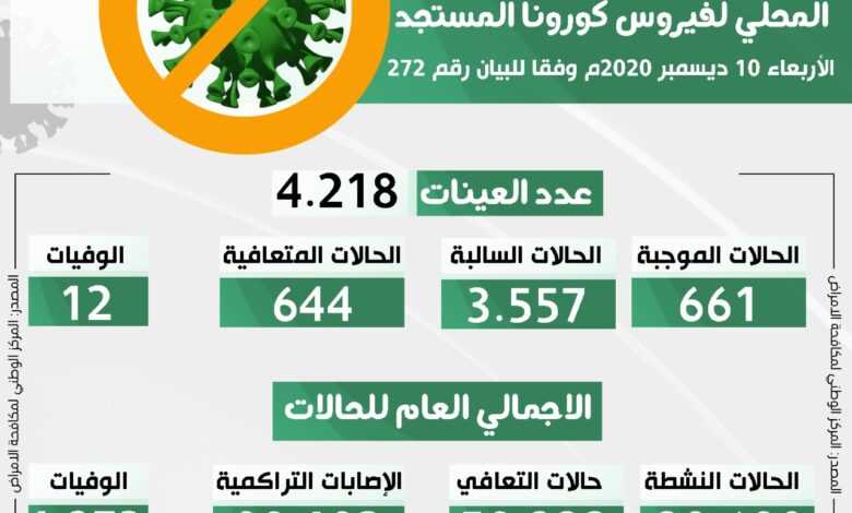 التحديث اليومي للوضع الوبائي المحلي لفيروس كورونا المستجد ليوم الاربعاء 09 ديسمبر 2020م وفقا للبيان رقم (272)