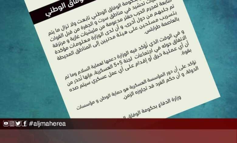 وحذرت وزارة دفاع السراج، خلال البيان، من أن أي عملية خرق أو إقدام على أي عمل عسكري سيتم صده بقوة.