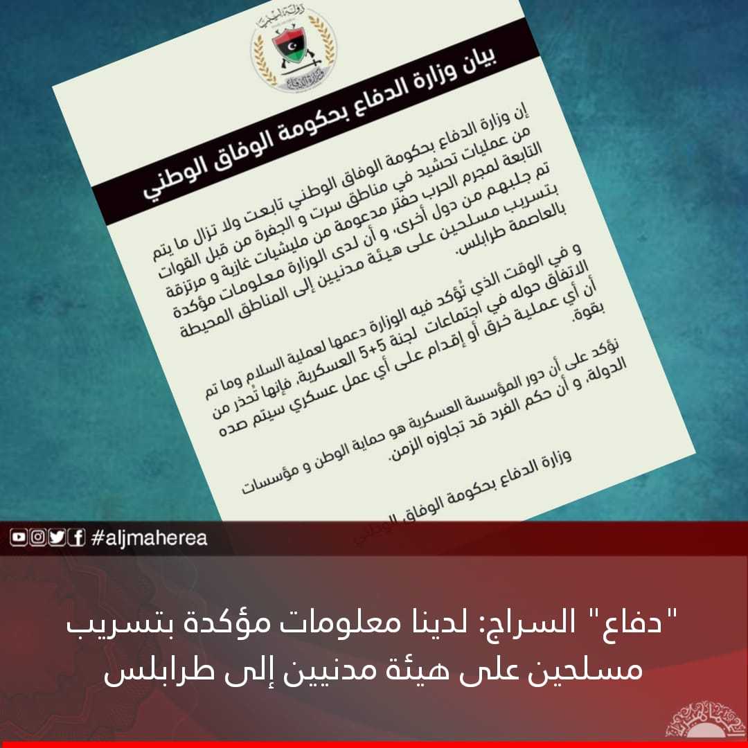 قالت وزارة الدفاع بحكومة السراج، مساء الخميس، إن لديها معلومات مؤكدة بتسريب مسلحين على هيئة مدنيين، تابعين لـ “الكرامة”، إلى المناطق المحيطة بالعاصمة طرابلس.