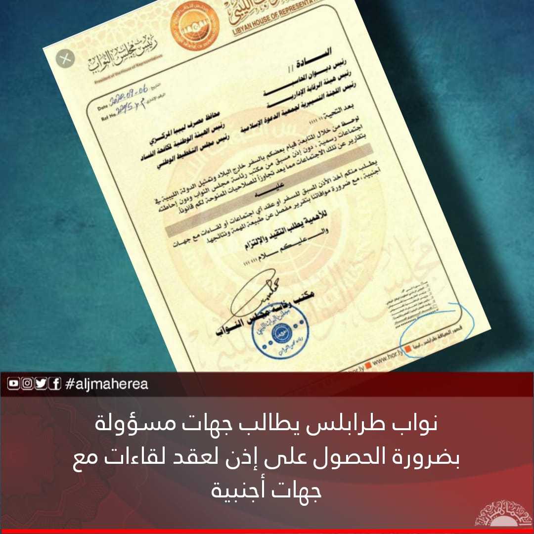 جاء ذلك بعد ملاحظة قيام بعض هذه الجهات بالسفر لخارج البلاد وتمثيل ليبيا في اجتماعات رسمية دون إذن مسبق من مكتب رئاسة مجلس نواب طرابلس ودون إحاطته بتقارير عن تلك الاجتماعات، مما يعد تجاوزا للصلاحيات القانونية.