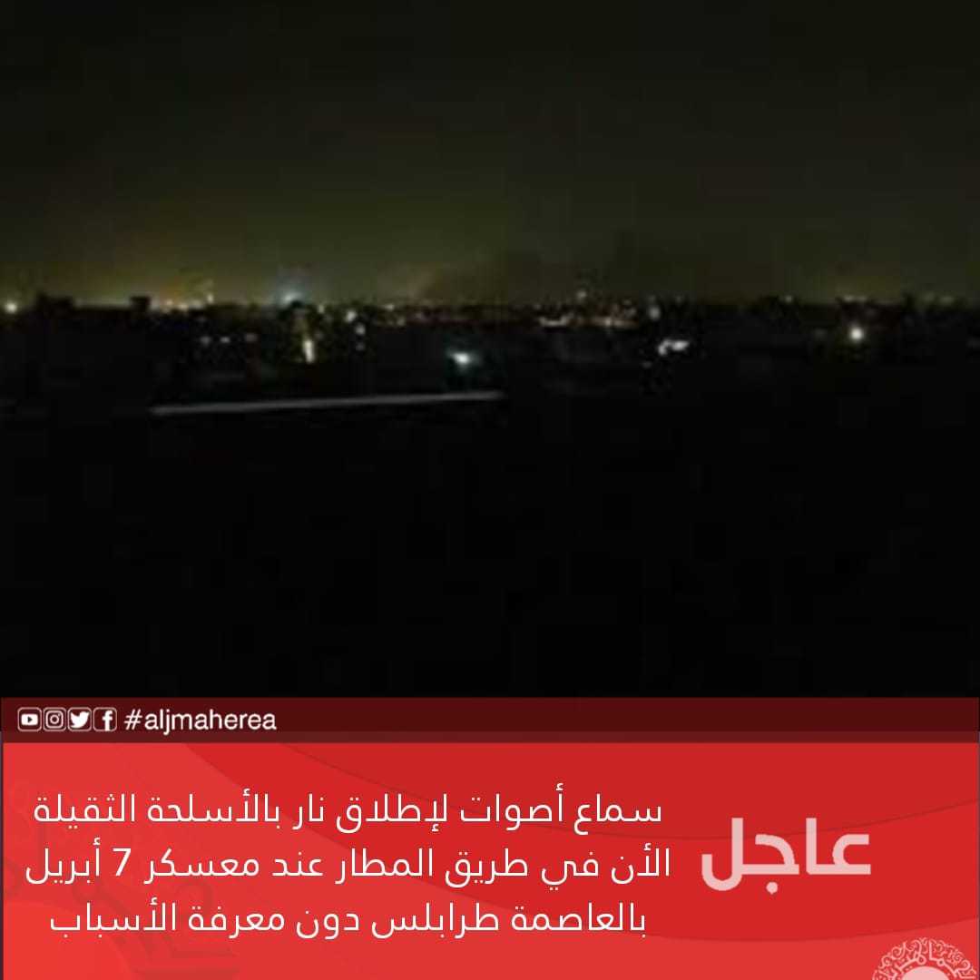 عاجل// سماع أصوات لإطلاق نار بالأسلحة الثقيلة الأن في طريق المطار عند معسكر 7 أبريل بالعاصمة طرابلس دون معرفة الأسباب