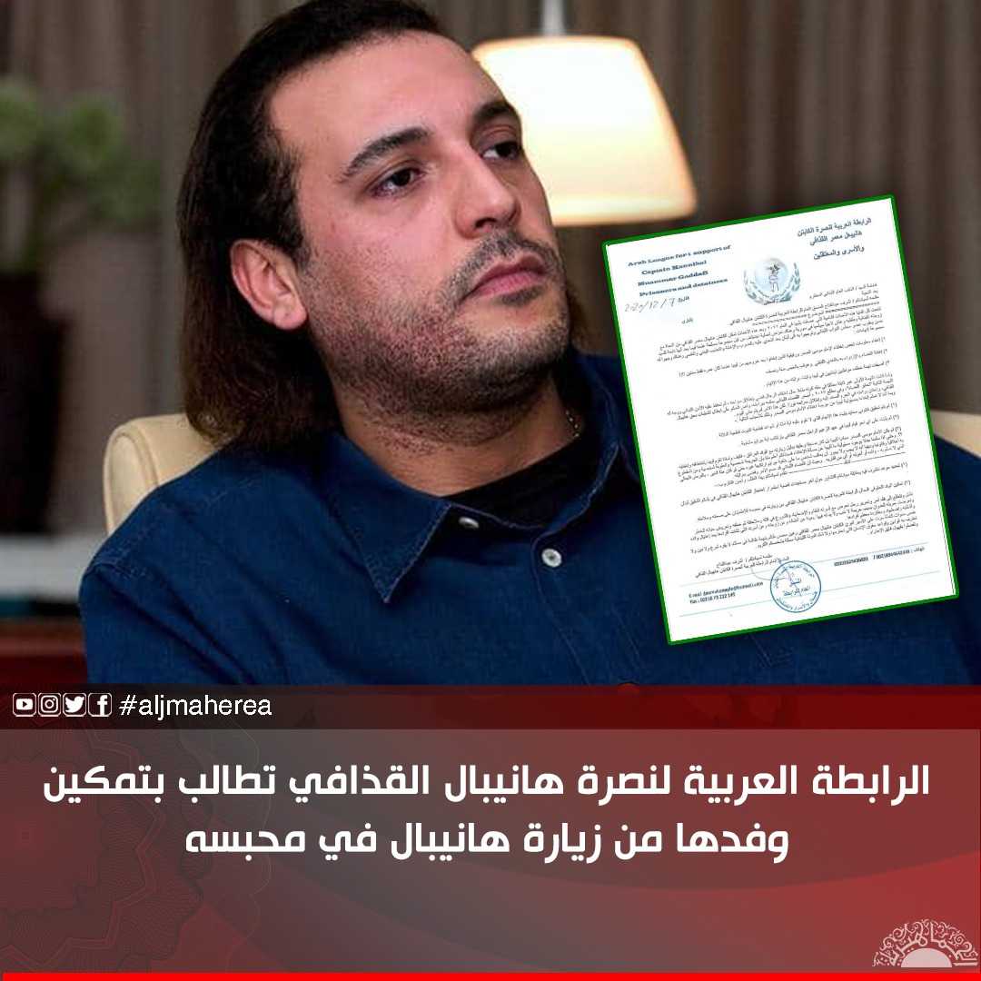 طالبت الرابطة العربية لنصرة الكابتن هانيبال القذافي، تمكين وفدها الحقوقي من زيارة هانيبال في محبسه للاطمئنان على صحته وسلامته.