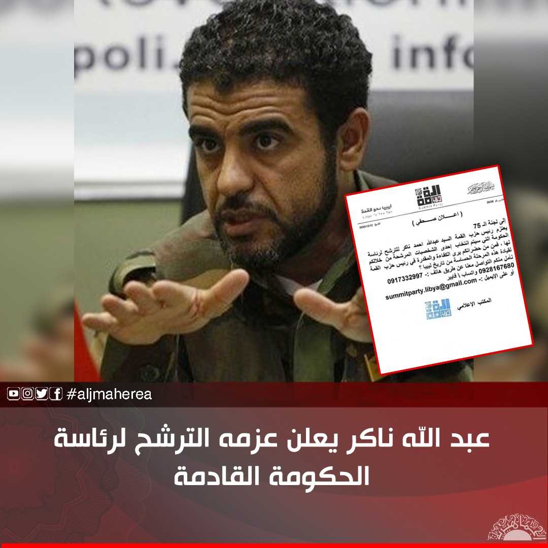 وقال “ناكر” في بيانه: “إلى لجنة الـ75 .. يعتزم رئيس حزب القمة عبدالله أحمد ناكر، الترشح لرئاسة الحكومة التي سيتم انتخاب إحدى الشخصيات المرشحة من خلالكم لها، فمن من حضراتكم يرى الكفاءة والمقدرة في رئيس حزب القمة لقيادة هذه المرحلة الحساسة من تاريخ ليبيا، نأمل منكم التواصل معنا عن طريق الهاتف أو واتساب/فايبر، أو على الإيميل” وفق قوله.