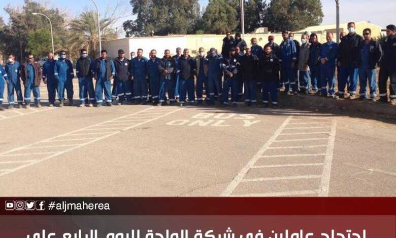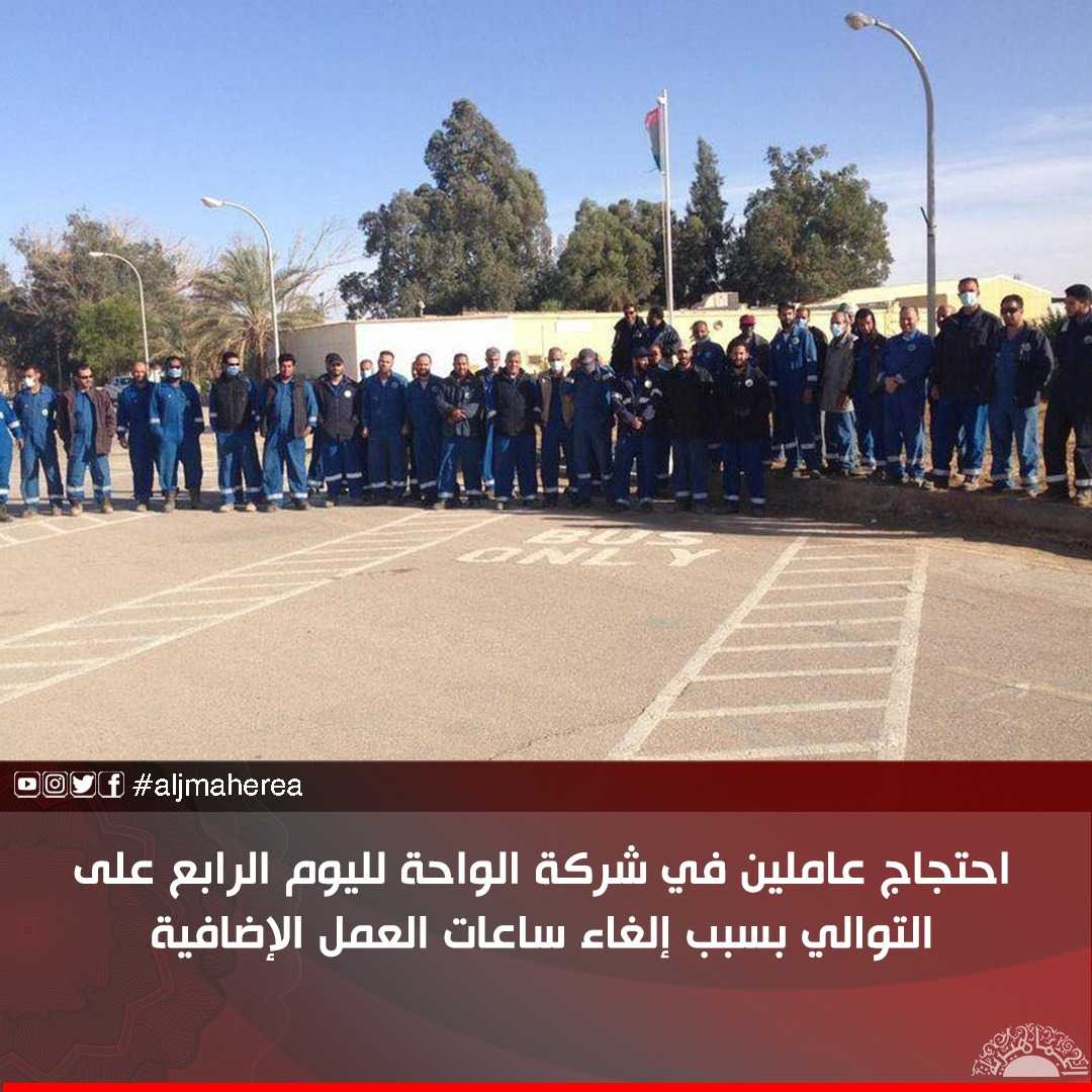 وقالت نقابة عمال الواحة في بيان عبر فيسبوك، إن الوقفة الاحتجاجية لمستخدمي حقل جالو مستمرة لليوم الرابع على التوالي؛ وذلك على خلفية مطالبتهم باستئناف نظام ساعات العمل الإضافي كما كان عليه الوضع قبل توقف الإنتاج.