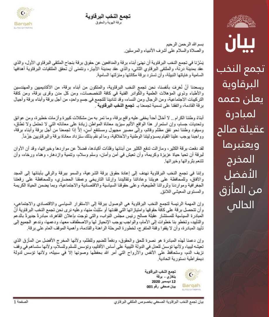 أعلن تجمع النخب البرقاوية، دعمه لمبادرة عقيلة صالح، رئيس مجلس نواب طبرق قائلا: إنها جديرة بالدعم والتأييد وتخطو بنا خطوات للأمام، ويعتقدون: أنها المخرج الأفضل من المأزق الحالي الذي تعيشه ليبيا وتؤسس لدولة ديمقراطية دستورية اتحادية.