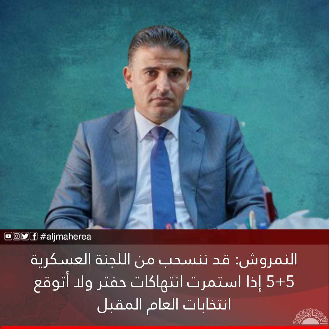 وهدد النمروش، بالانسحاب من لجنة 5+5 لوقف اطلاق النار اذا استمرت الانتهاكات، في إشارة لهجوم قوات الكرامة، على معسكر تيندي المعروف بـ”المغاوير” في منطقة أوباري.