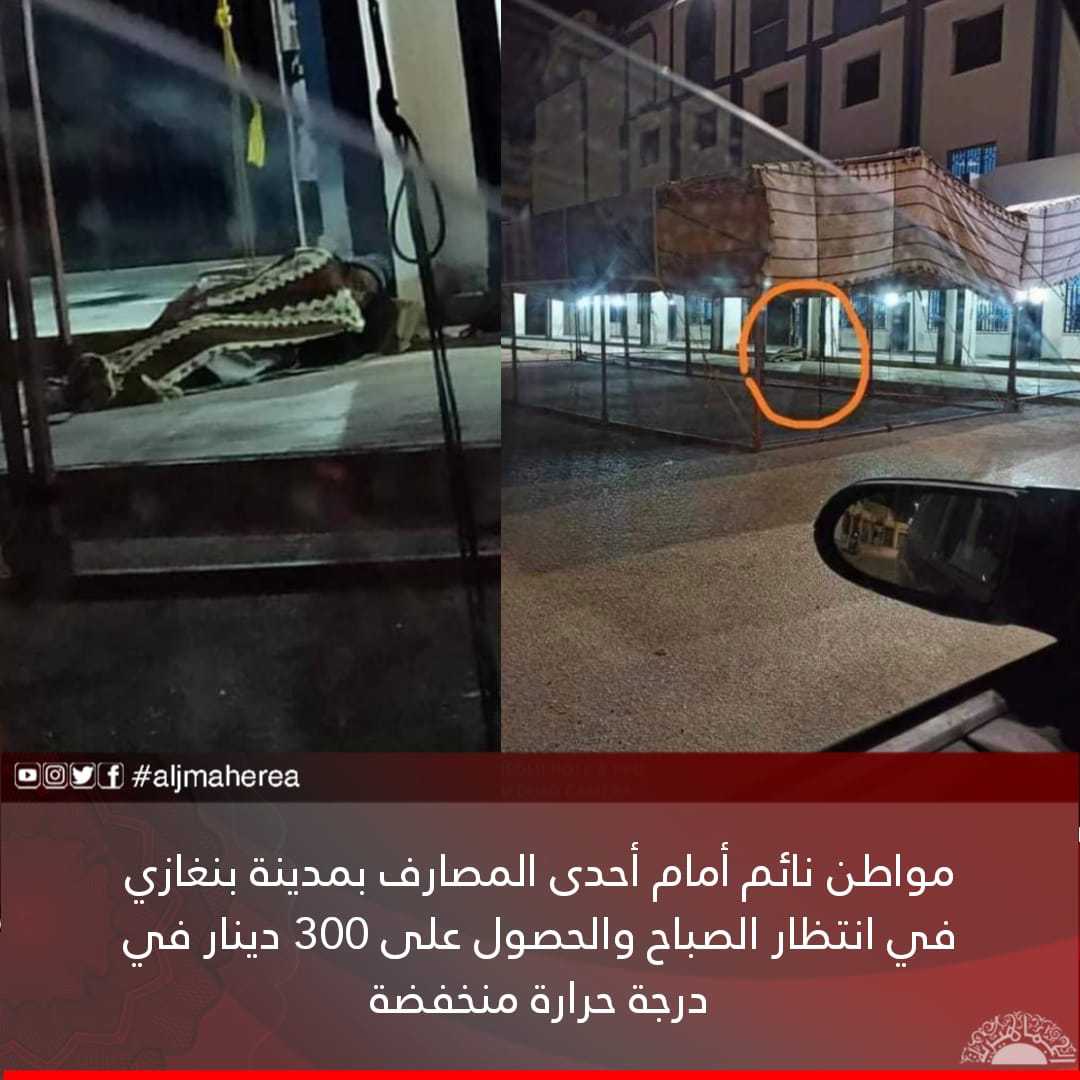 مواطن نائم أمام إحدى المصارف بمدينة بنغازي في انتظار الصباح والحصول على 300 دينار في درجة حرارة منخفضة.