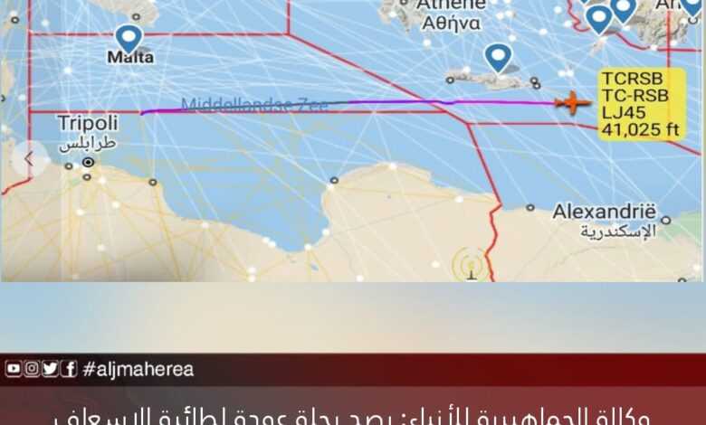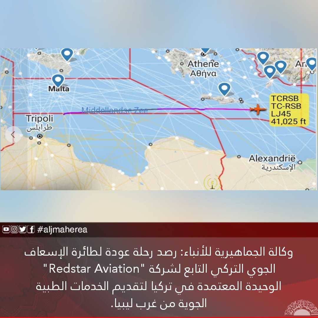 وكالة الجماهيرية للأنباء: رصد رحلة عودة لطائرة الإسعاف الجوي التركي التابع لشركة “Redstar Aviation” الوحيدة المعتمدة في تركيا لتقديم الخدمات الطبية الجوية من غرب ليبيا.