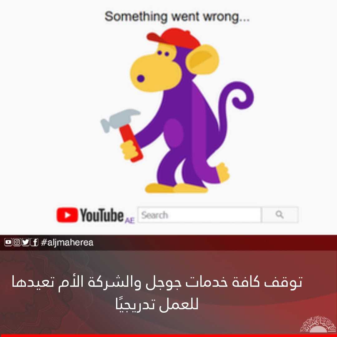شهدت جميع خدمات شركة جوجل انقطاعًا واسع النطاق حول العالم، منع ملايين المستخدمين من الوصول إلى خدمات مثل يوتيوب وجي ميل وجوجل درايڤ، وحتى مُحرك البحث العملاق جوجل سيرش، وذلك لمشاكل تقنية لم تكشف الشركة عن تفاصيلها بعد.