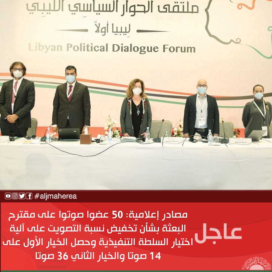 عاجل // مصادر إعلامية: 50 عضوا صوتوا على مقترح البعثة بشأن تخفيض نسبة التصويت على آلية اختيار السلطة التنفيذية وحصل الخيار الأول على 14 صوتا والخيار الثاني 36 صوتا