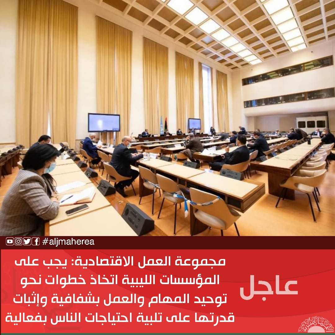 عاجل // مجموعة العمل الاقتصادية: يجب على المؤسسات الليبية اتخاذ خطوات نحو توحيد المهام والعمل بشفافية وإثبات قدرتها على تلبية احتياجات الناس بفعالية