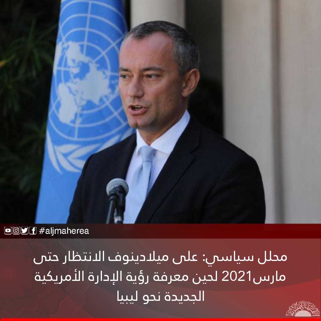 طالب المحلل السياسي، كامل المرعاش، المبعوث الأممي الجديد، نيكولاي ميلادينوف بالانتظار حتى مارس 2021 المقبل، حتى تتضح رؤية الإدارة الأمريكية الجديدة تجاه الملف الليبي وبروز معطيات جديدة على المستوى الليبي والدولي.