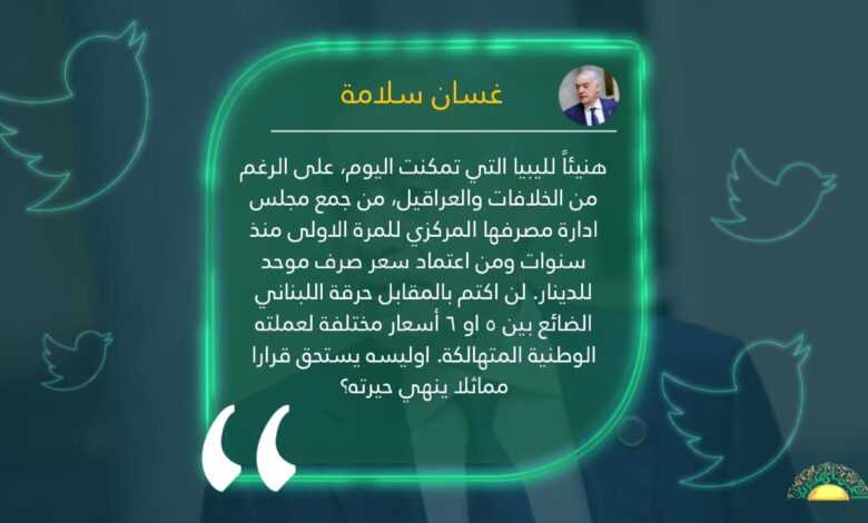 هنيئاً لليبيا التي تمكنت اليوم، على الرغم من الخلافات والعراقيل، من جمع مجلس ادارة مصرفها المركزي للمرة الاولى منذ سنوات ومن اعتماد سعر صرف موحد للدينار. لن اكتم بالمقابل حرقة اللبناني الضائع بين ٥ او ٦ أسعار مختلفة لعملته الوطنية المتهالكة. اوليسه يستحق قرارا مماثلا ينهي حيرته؟