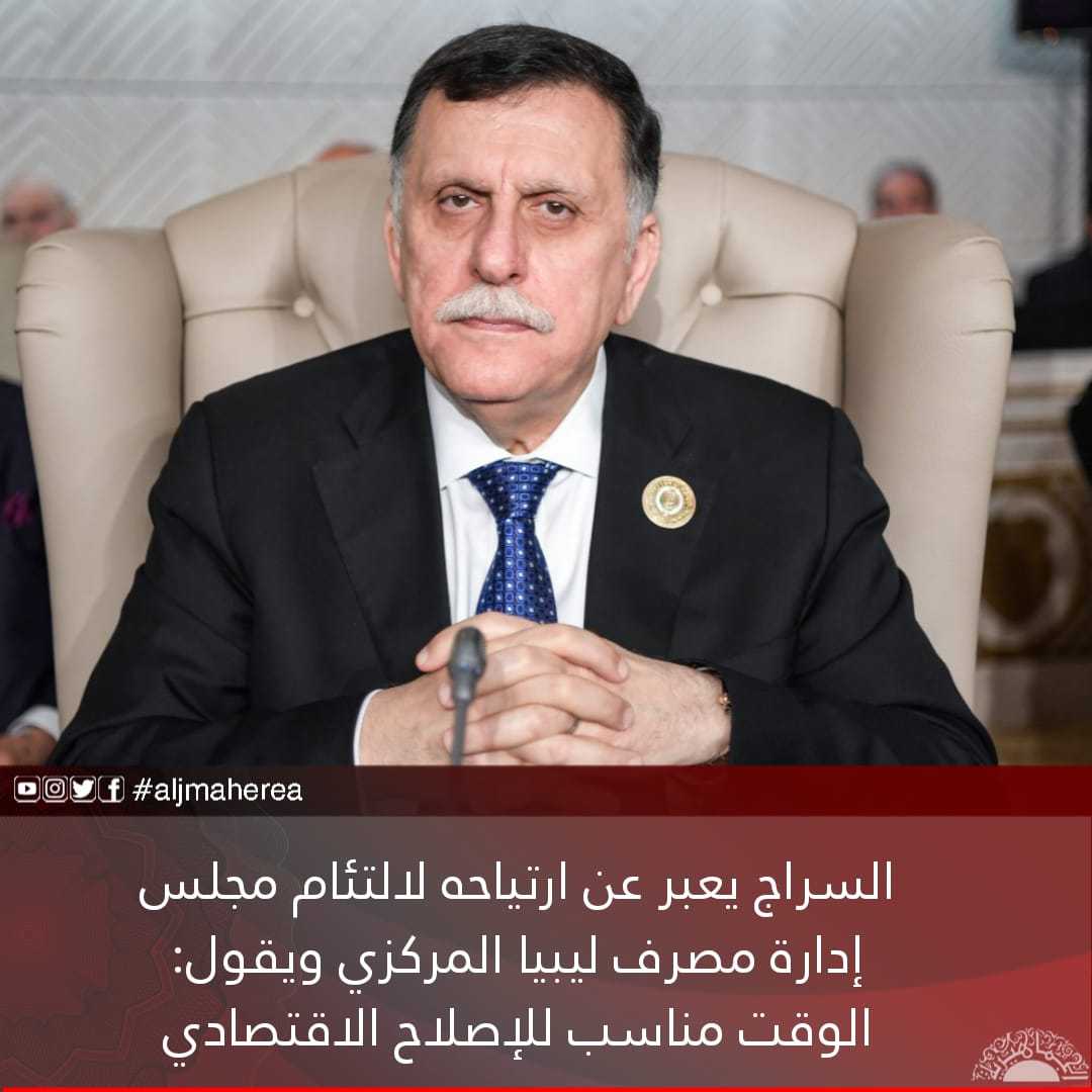 وأعرب السراج، عن ارتياحه لالتئام مجلس إدارة مصرف ليبيا المركزي بعد انتظار دام لسنوات، ليستجيب لمطلب توحيد سعر صرف الدينار.