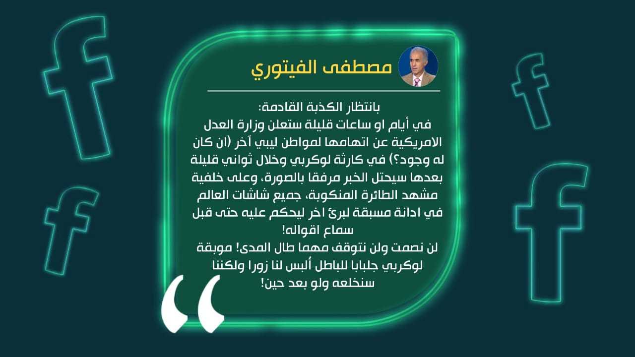 وأكد الفيتوري “لن نصمت ولن نتوقف مهما طال المدى! موبقة لوكربي جلبابا للباطل أُلبس لنا زورا ولكننا سنخلعه ولو بعد حين!”.