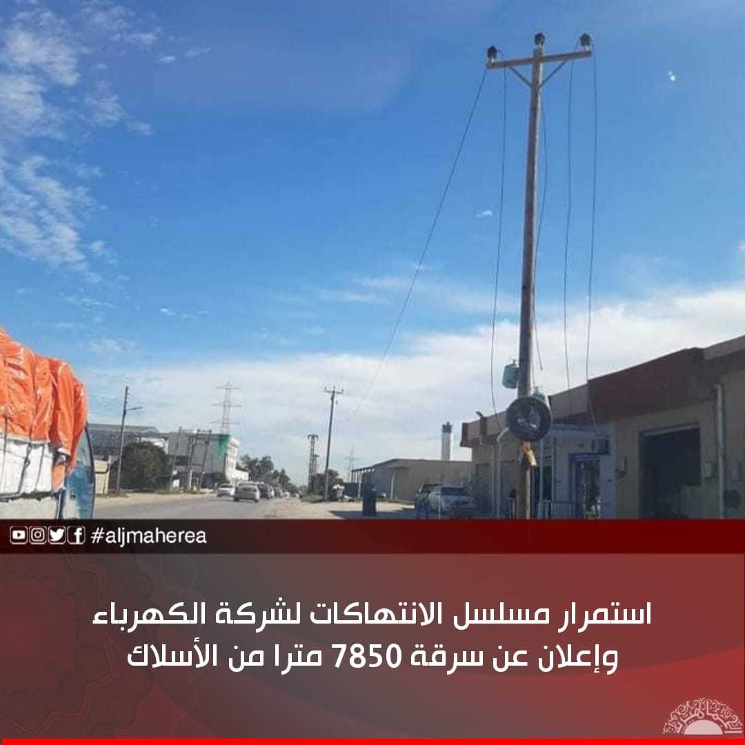 يتواصل مسلسل سرقة أسلاك الكهرباء في مختلف المناطق الليبية، حيث أعلنت الشركة العامة للكهرباء عن سرقة 7,850 مترًا من الأسلاك، يوم الخميس، بعدة مناطق، من قبل مجهولين.