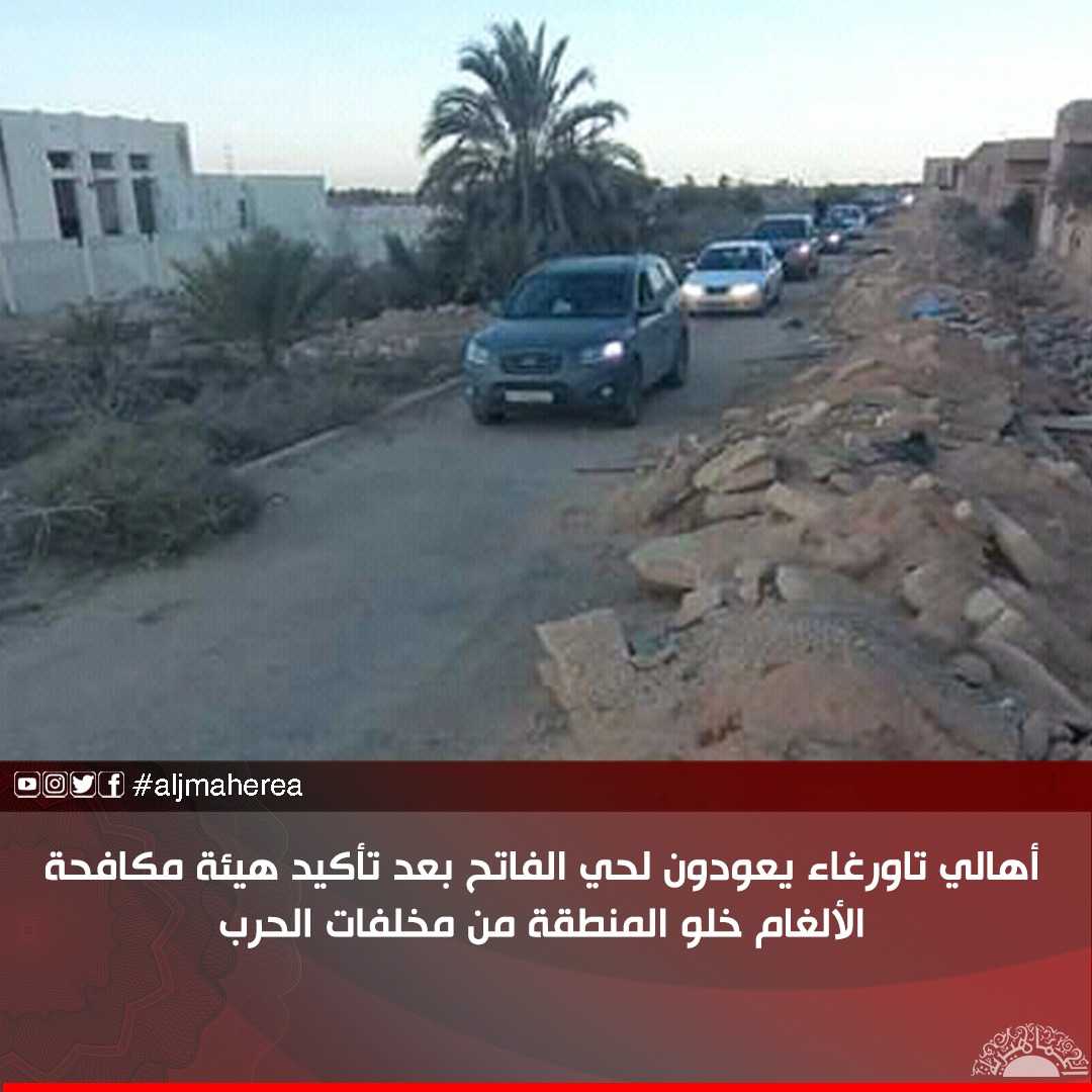 وأوضحت مصادر أن أجواءًا مفعمة بالفرح وبسمة رسمت على وجوه سكان حي الفاتح “علام” عمت بعد إعطاء الإذن لدخول الأهالي للحي السكني، وذلك بعد استلام رئيس المجلس المحلي تاورغاء عبدالرحمن شكشاك رسالة من الهيئة الليبية لمكافحة الألغام ومخلفات الحرب مفادها خلو المنطقة من مخلفات الحرب .