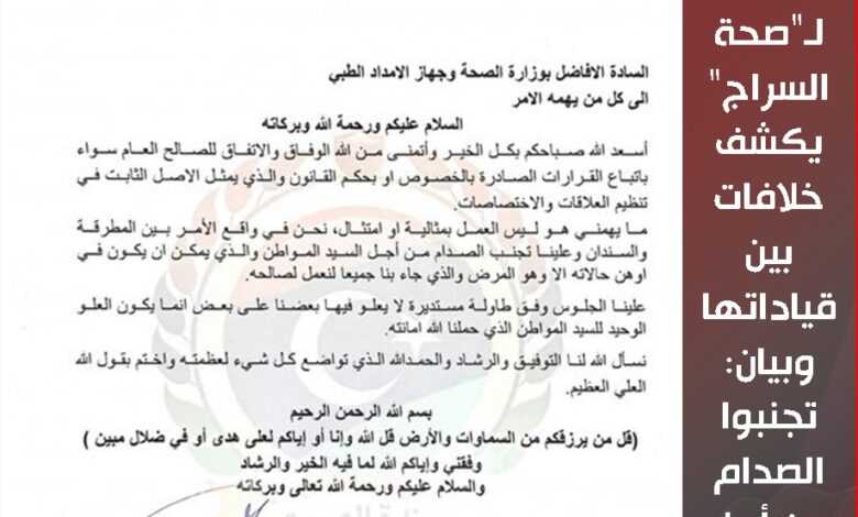 في رسالة غامضة، تؤكد وجود صراعات بين قيادات الصحة التابعة لحكومة السراج غير الشرعية، طالب عبد الرحمن أحمد عمير، وكيل وزارة الصحة لشؤون الإمداد والمشروعات، الادارات المختلفة بالاتفاق للصالح العام، سواء باتباع القرارات الصادرة بالخصوص أو بالامتثال لحكم القانون الذي ينظم العلاقات والاختصاصات.