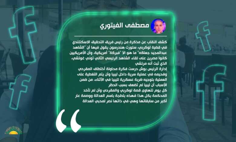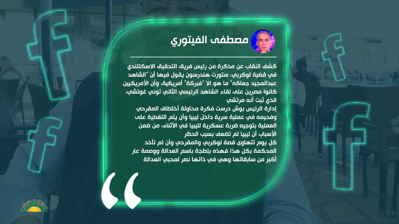 وقال الفيتوري في تدوينة على صفحته على فيسبوك، عنونها بـ “تحية للراحل موغابي…الحافظ للجميل والمخلص لليبيا حتى مماته!”، “في وثائق رٌفعت عنها السرية ونٌشر بعضها اليوم كٌشف النقاب عن مذكرة من رئيس فريق التحقيق الاسكتلندي في قضية لوكربي، ستورت هندرسون(Stuart Henderson)، يقول فيها أن “الشاهد عبدالمجيد جعاكه” ما هو الا “فبركة” أمريكية وأن شهادته غير مفيدة وأن وجوده بين الشهود كان نتيجة أصرار أمريكي وليس نتيجة حقائق قدمها ويملكها العميل جعاكه وأن وجوده وضعهم في موقف حساس للأخد بأقواله وهم يعرفون كذبه! وأشتكى هندرسون من أن الأمريكيين كانوا مصرين على لقاء الشاهد الرئيسي الثاني توني غوتشي، الذي ثبت أنه مرتشي، وطرحوا حتى فكرة نقله الي أمريكا! ويعود تاريخ المذكرة الي أكتوبر من عام 1991 اي أثناء التحقيقات في لوكربي وثلاث سنوات بعد الحادثة وقبل المحاكمة في هولندا، ما يعني الشرطة الأسكتلندية كانت تشك في كل ما يفعله الأمريكيون في التحقيق ولكنهم عجزوا عن منعهم! هذة وثيقة اخرى لم تصل الي الدفاع حينها!”