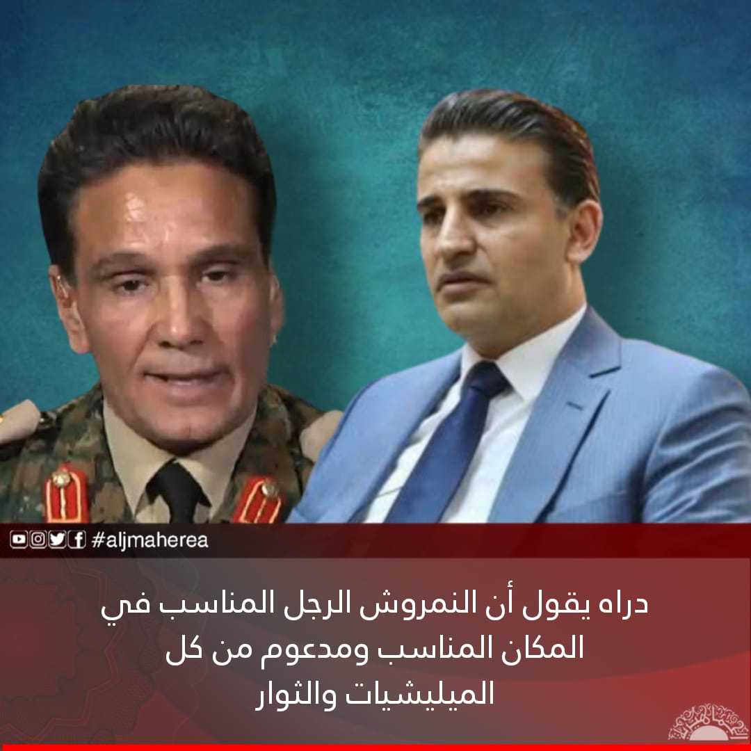 دراه، وفي تغطية تلفزيونية تابعتها قناة “الجماهيرية”، مساء السبت، عبر قناة “التناصح”، قال: “نحن لم نشاهد كليات عسكرية تشتغل، ولم نشاهد وزير دفاع يزور التباب الأمامية إلا عندما استلم النمروش، فهو يدعم كل القوات على الأرض”