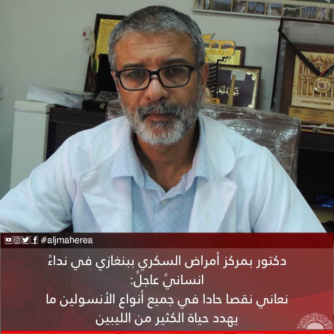 وجه الدكتور عوض القويري من مركز أمراض السكري ببنغازي، نداءً انسانيًا عاجلًا، بشأن نقص حاد في جميع أنواع “الأنسولين” ما يهدد حياة الكثير من الليبيين الذين لايستطيعون العيش بدونه.