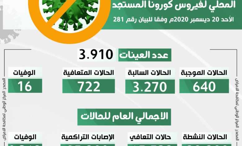 نشر مركز مكافحة الأمراض التحديث اليومي للوضع الوبائي المحلي لفيروس كورونا المستجد ليوم الأحد