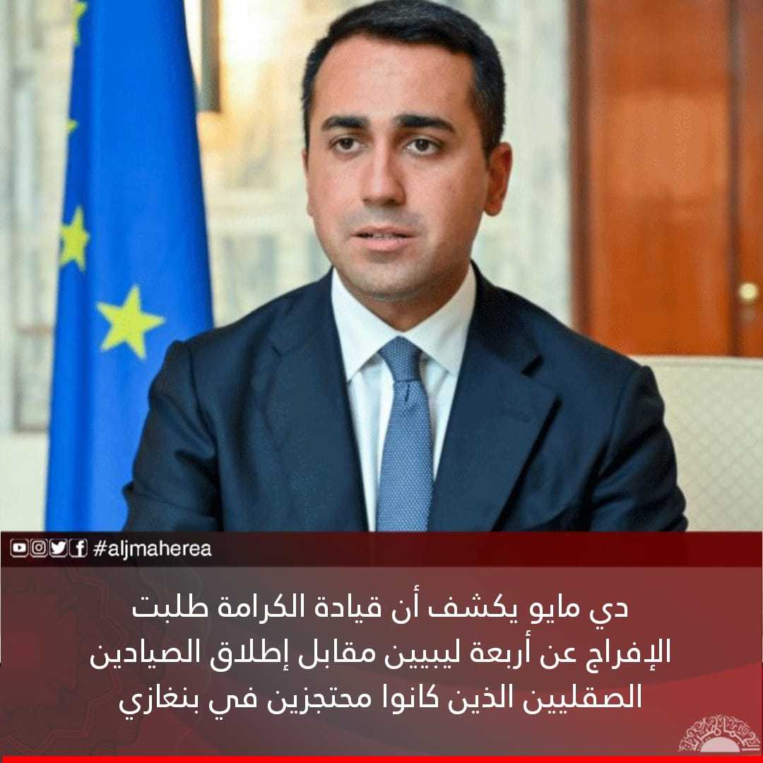 كشف وزير الخارجية الإيطالي لويغي دي مايو أن قيادة الكرامة طلبت الإفراج عن أربعة ليبيين مدانيين بأحكام اتجار بالبشر في إيطاليا، مقابل إطلاق الصيادين الصقليين الذين كانوا محتجزين في بنغازي.