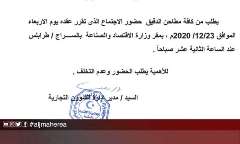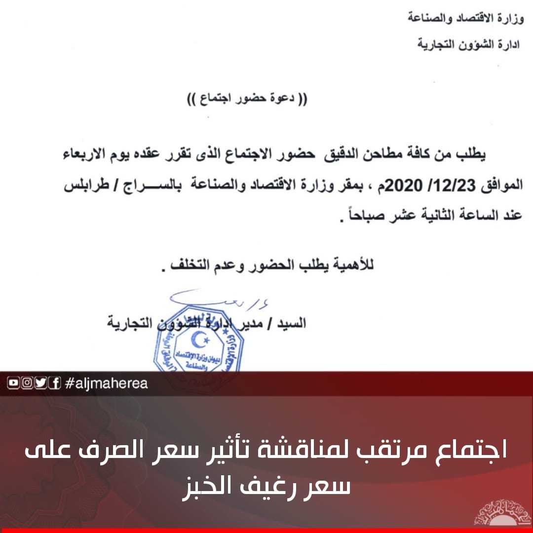 دعا مدير إدارة الشؤون التجارية بوزارة الاقتصاد والصناعة بحكومة السراج، كافة مسؤولي شركات مطاحن الدقيق، لمناقشة سعر الصرف الجديد وتأثيره على السوق المحلي، وبالتالي تأثيره على أسعار الدقيق، إضافة إلى توفير الدقيق في المخابز.