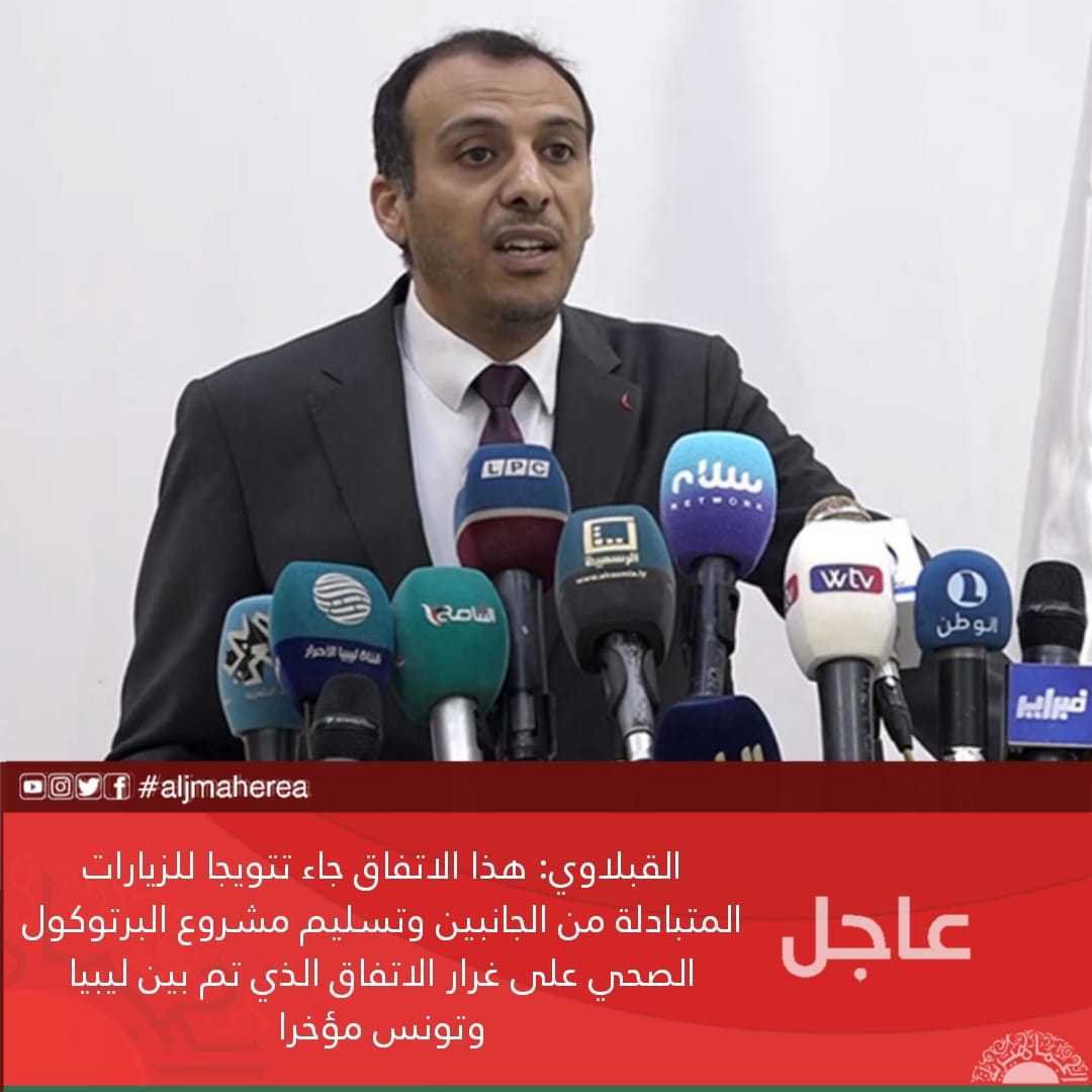عاجل // القبلاوي: هذا ‏الاتفاق جاء تتويجا للزيارات المتبادلة من الجانبين وتسليم مشروع البرتوكول الصحي على غرار الاتفاق الذي تم بين ليبيا وتونس مؤخرا