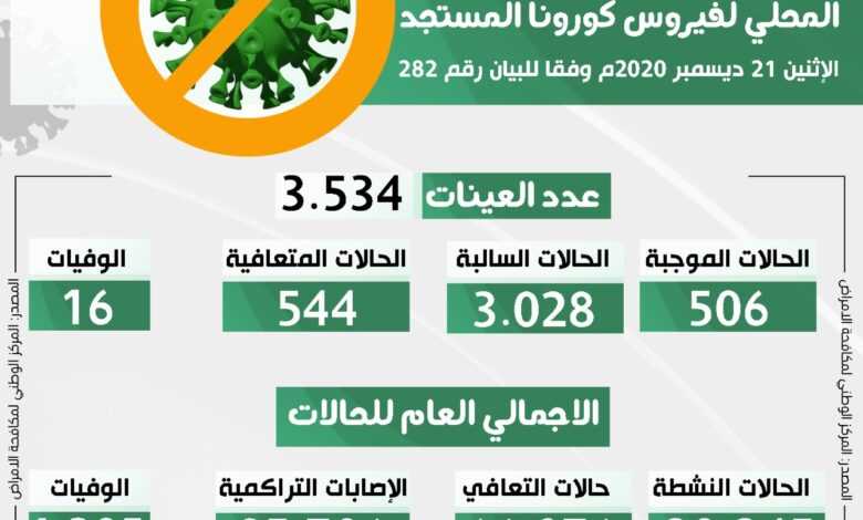 التحديث اليومي للوضع الوبائي المحلي لفيروس كورونا المستجد ليوم الاثنين 21 ديسمبر 2020