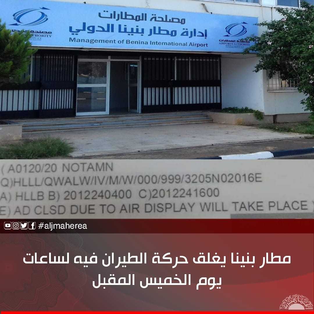 أعلنت إدارة مطار بنينا الدولي، أنه سيتم إقفال الرحلات من وإلى المطار لساعات يوم الخميس المقبل.