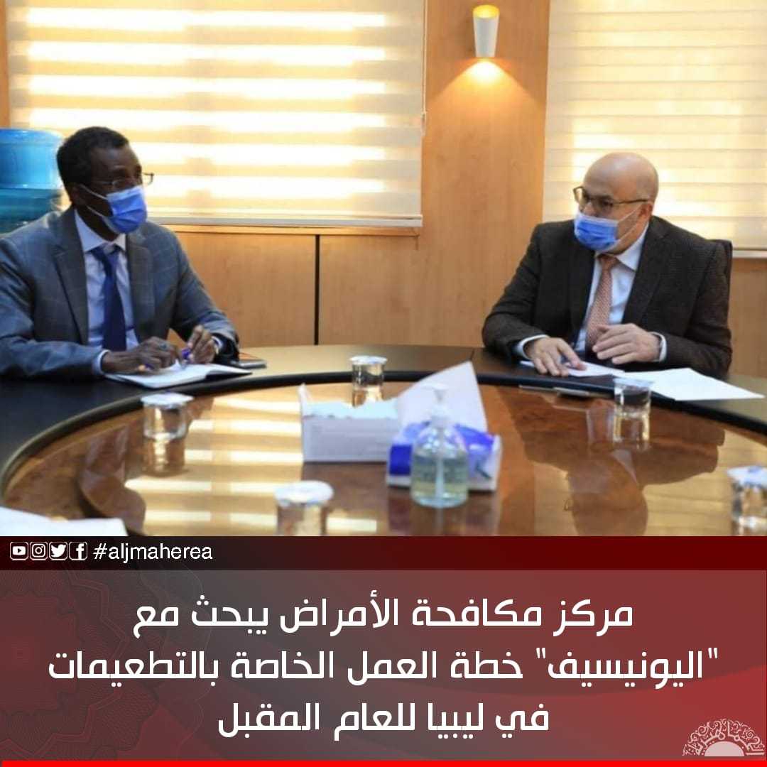 بحث مدير مركز مكافحة الأمراض، د. بدر الدين النجار، مع ممثل منظمة اليونيسيف في ليبيا، التعاون المشترك ووضع خطة العمل المشتركة للعام المقبل خاصة فيما يتعلق بالتطعيمات.