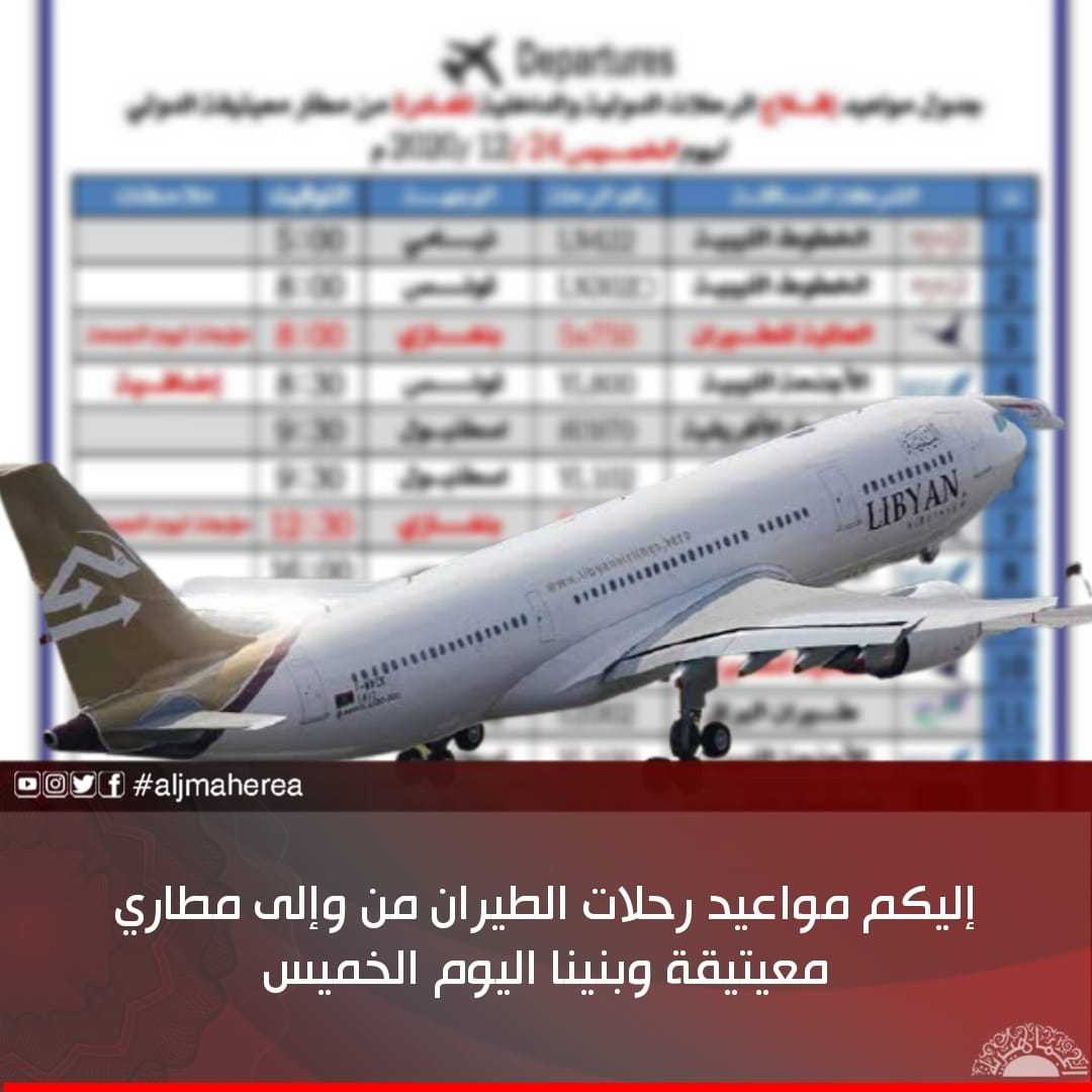 إليكم مواعيد رحلات الطيران من وإلى مطاري معيتيقة وبنينا اليوم الخميس
