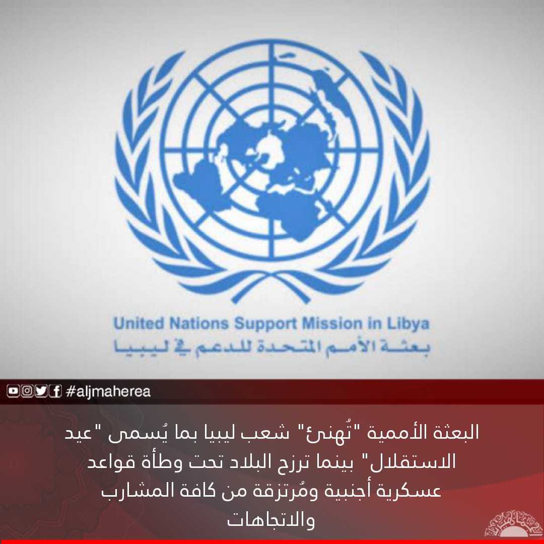 قالت البعثة الأممية للدعم في ليبيا اليوم الخميس أنها تُهنئ الليبيين داخل البلاد وخارجها، بحلول ذكرى ما يُسمى عيد الاستقلال.
