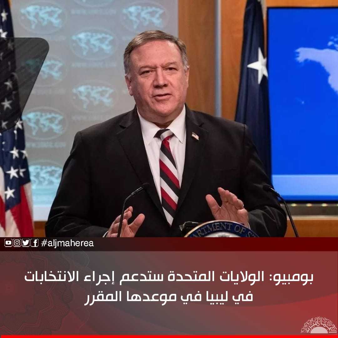 أكد وزير الخارجية الأميركي، مايك بومبيو، أن الولايات المتحدة ستدعم في السنة القادمة 2021 الليبيين من أجل مساعدتهم على التنفيذ الكامل لاتفاق وقف إطلاق النار الموقع يوم 23 أكتوبر الماضي، وإجراء الانتخابات المقررة يوم 24 ديسمبر 2021.